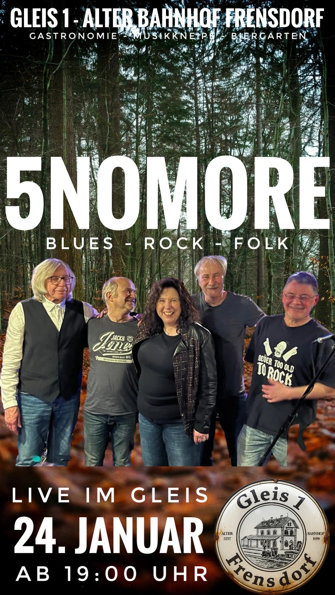 Die fünfköpfige Band 5NoMore besteht mittlerweile seit 5 Jahren. Nach verschiedenen Auftritten im Raum Bamberg wollen sie nun im Gleis1 für Begeisterung sorgen. Songperlen aus dem Bereich Rock, Blues und Folk, die man nicht alle Tage hört. Getragen wird das alles durch die markant bluesige Stimme der Sängerin Gabi. Songs von Neil Young, Tom Waits, Bob Dylan oder Amy Whinehouse.